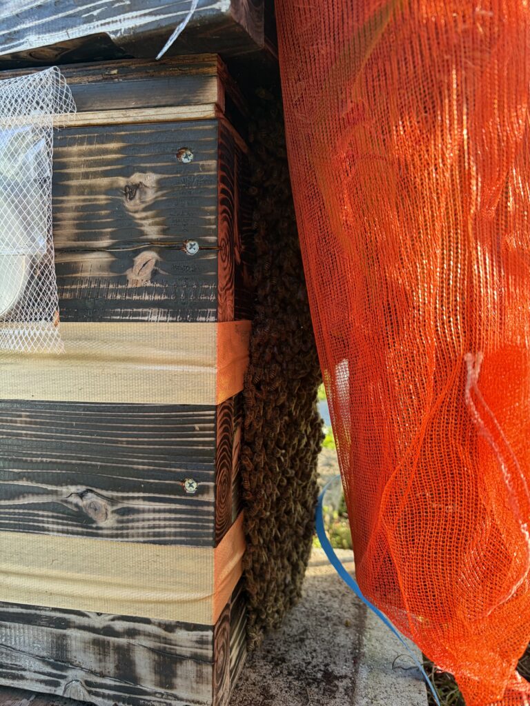 そして、同日まさかの蜂場Sにて、キンリョウヘンと巣箱に挟まるように群がる蜂球発見を発見!!