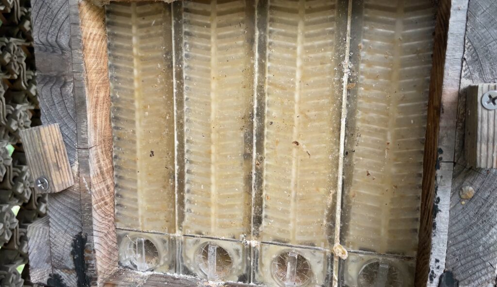 フローハイブの貯蜜層だけを確認してみると、残念ながら蜜はまだ溜まっていませんでした。ですが、しっかりと蜂たちが層の中にいる姿を確認でき、ホッと一安心。